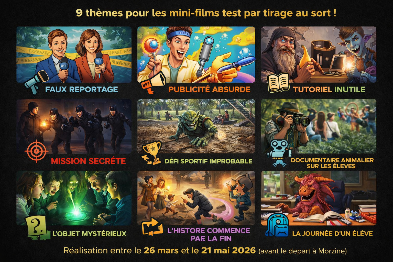 Après la présentation du Film Zéro, les élèves réaliseront 9 mini films d’entraînement entre le 26 mars et le 26 mai. Le but étant d’explorer sa créativité à travers un reportage, interview, humour, mise en scène, découverte d’un lieu, activité sportive, etc.