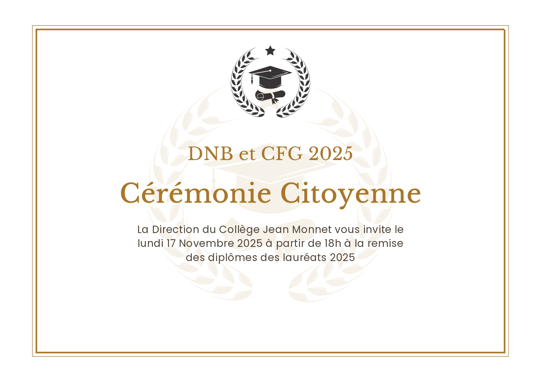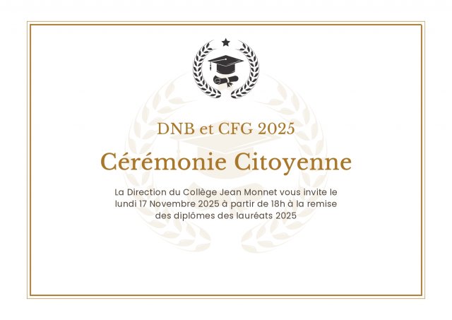 Le lundi 17 novembre 2025, les élèves de 3ème de la promotion 2024/2025 participeront à la cérémonie républicaine de remise de leur Diplôme National du Brevet et du Certificat de Formation Générale.